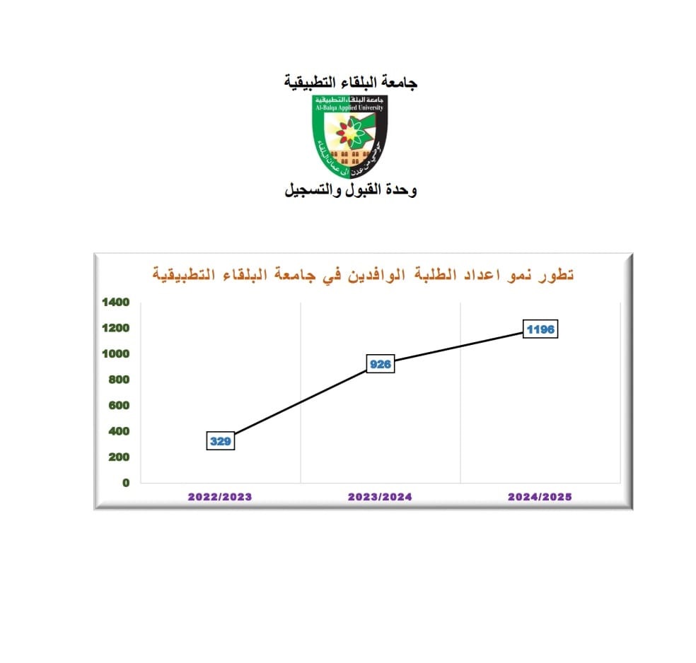 شهدت جامعة البلقاء التطبيقية زيادة ملحوظة في أعداد الطلبة الوافدين خلال الأعوام الدراسية الأخيرة، وفقًا للإحصاءات الصادرة عن وحدة القبول والتسجيل بالجامعة. حيث ارتفع عدد الطلبة الوافدين من 329 طالب وطالبة في العام الدراسي 2022/2023 إلى 926 في العام 2023/2024، ووصل العدد إلى 1196 طالب وطالبة في بداية العام الدراسي 2024/2025.
