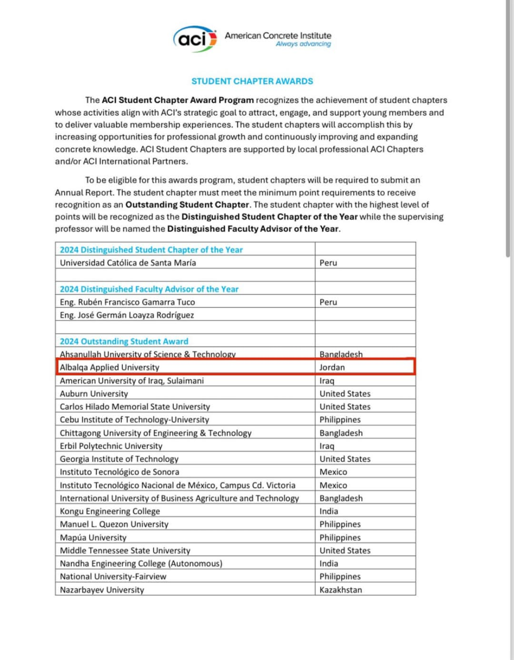 وتُعد الجائزة من أرفع الجوائز الأكاديمية في قطاع الهندسة المدنية على مستوى العالم، حيث تنافست عليها فروع طلابية من جامعات دولية مرموقة، وقد تم تسليط الضوء على إنجاز جامعة البلقاء التطبيقية عبر مجلة Concrete International ومنصة ACI News Webpage، وهما من أهم المراجع المتخصصة عالميًا.