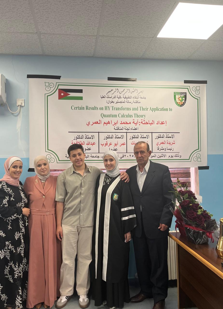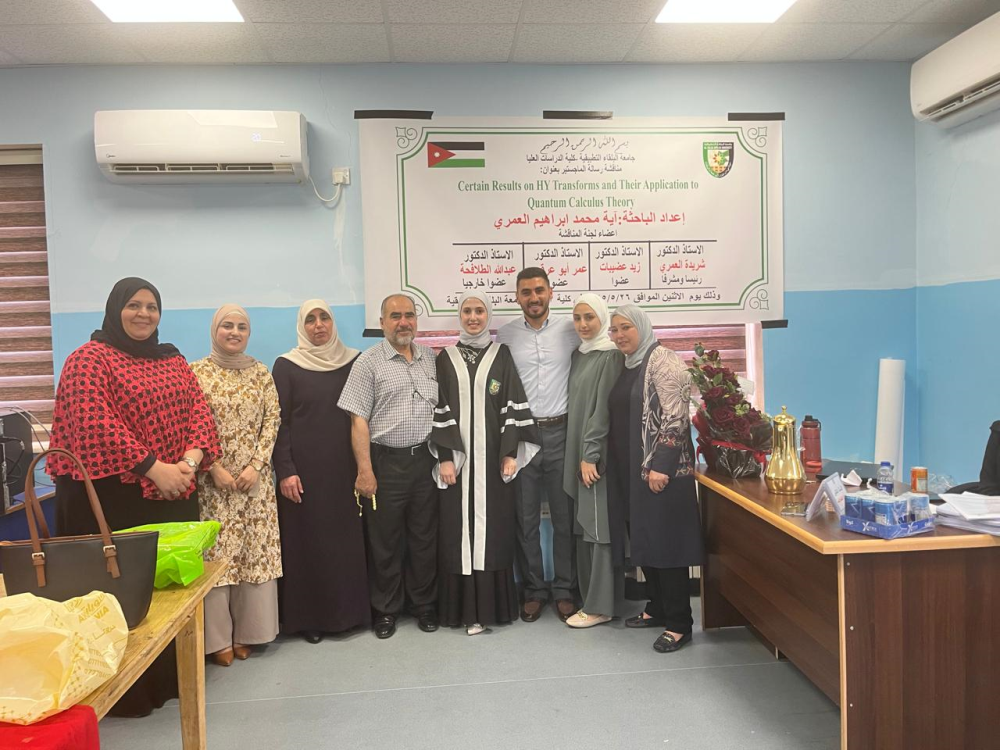 تم في ظهر يوم الإثنين الموافق 26/5/2025 مناقشة رسالة ماجستير للطالبة آية محمد إبراهيم العمري بقسم الرياضيات في كلية العلوم في جامعة البلقاء التطبيقية/ السلط و بعنوان :