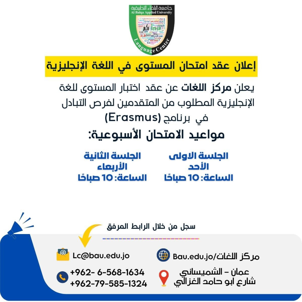 يعلن مركز اللغات – جامعة البلقاء التطبيقية عن عقد امتحان تحديد مستوى اللغة الإنجليزية للراغبين في التقدم لبرامج التبادل الأكاديمي (Erasmus) بين جامعة البلقاء التطبيقية والجامعات والهيئات الدولية.