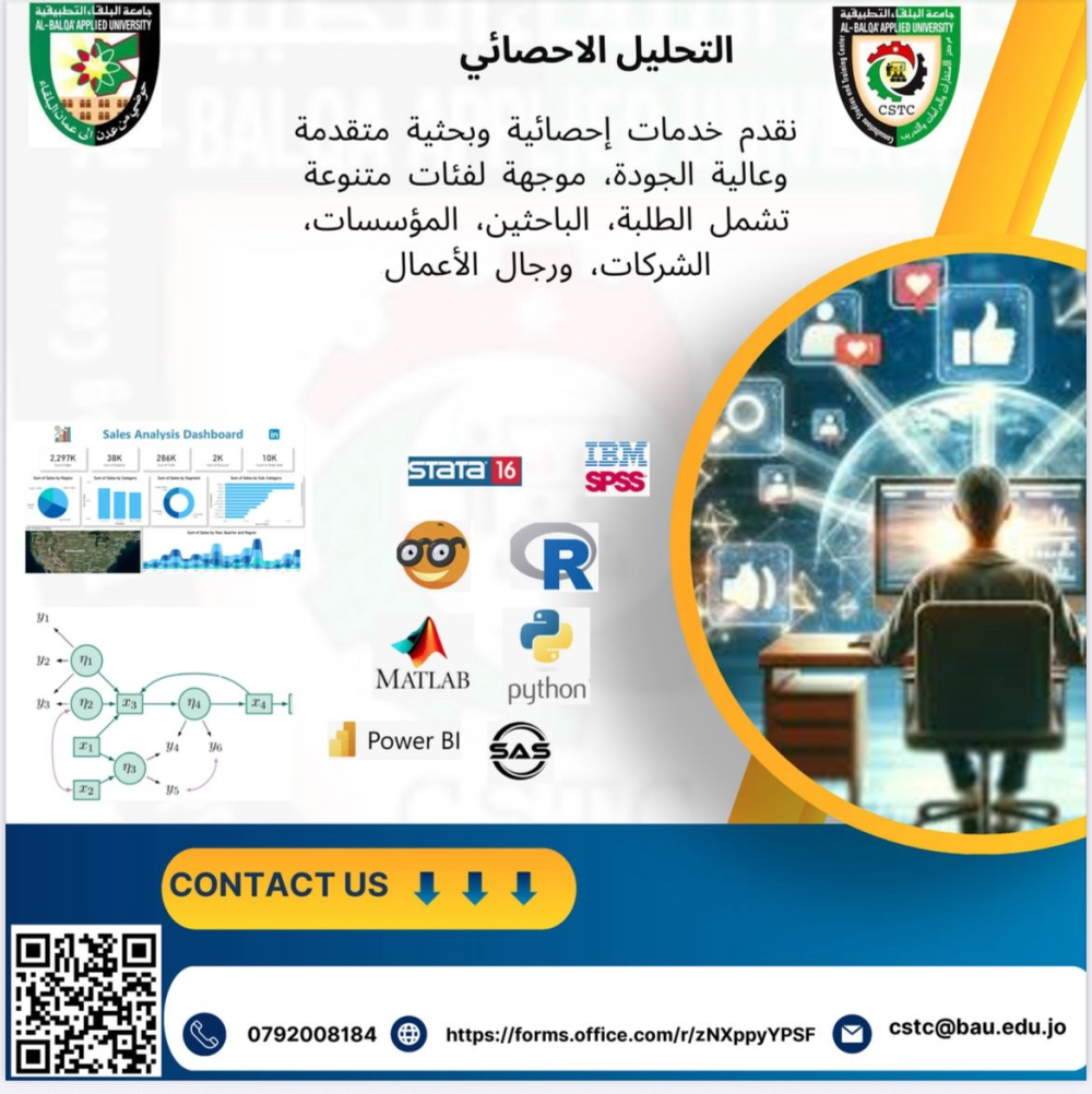 * جميع الخدمات الإحصائية المقدمة من مركز الاستشارات مصدقة وتطبق وفقًا لتعليمات البحث العلمي في جامعة البلقاء التطبيقية.