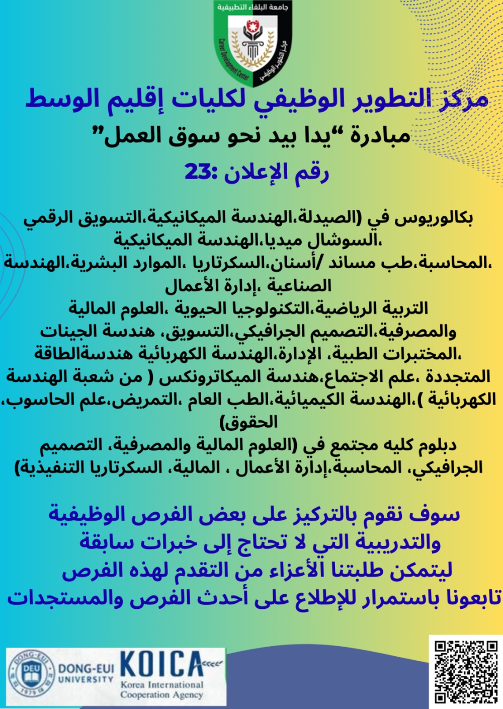 في خطوة جديدة نحو تعزيز جاهزية الطلبة والخريجين لسوق العمل، أعلن مركز التطوير الوظيفي في كليات إقليم الوسط بجامعة البلقاء التطبيقية عن إطلاق الثالثة والعشرون من الفرص التدريبية والتوظيفية، ضمن مبادرة "يدًا بيد نحو سوق العمل".