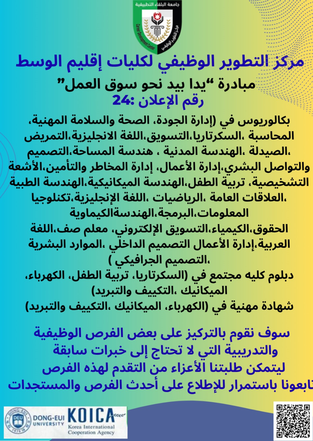 في خطوة جديدة نحو تعزيز جاهزية الطلبة والخريجين لسوق العمل، أعلن مركز التطوير الوظيفي في كليات إقليم الوسط بجامعة البلقاء التطبيقية عن إطلاق الدفعة الرابعة والعشرون من الفرص التدريبية والتوظيفية، ضمن مبادرة "يدًا بيد نحو سوق العمل".