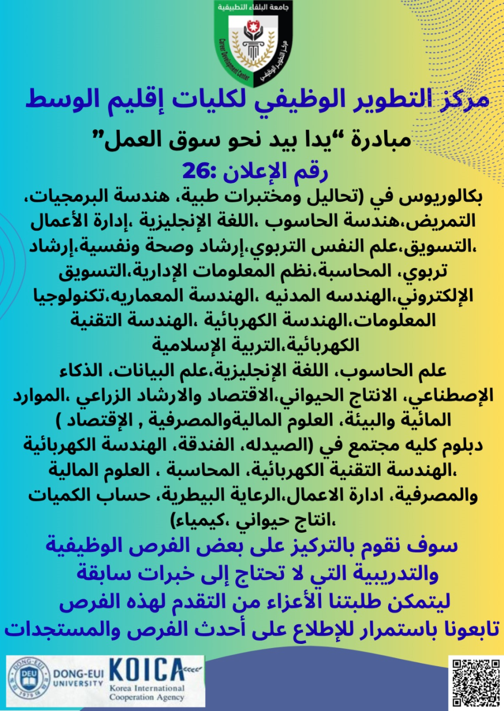في خطوة جديدة نحو تعزيز جاهزية الطلبة والخريجين لسوق العمل، أعلن مركز التطوير الوظيفي في كليات إقليم الوسط بجامعة البلقاء التطبيقية عن إطلاق الدفعة السادسة والعشرون من الفرص التدريبية والتوظيفية، ضمن مبادرة "يدًا بيد نحو سوق العمل".
