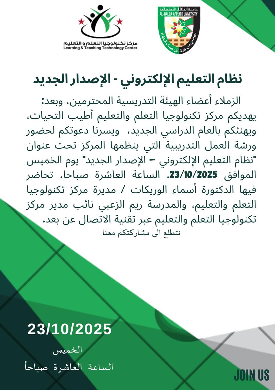يهديكم مركز تكنولوجيا التعلم والتعليم أطيب التحيات، ويهنئكم بالعام الدراسي الجديد،  ويسرنا دعوتكم لحضور ورشة العمل التدريبية التي ينظمها المركز تحت عنوان  "نظام التعليم الإلكتروني – الإصدار الجديد" يوم الخميس الموافق 23/10/2025، الساعة العاشرة صباحا، تحاضر فيها الدكتورة أسماء الوريكات / مديرة مركز تكنولوجيا التعلم والتعليم، والمدرسة ريم الزعبي نائب مدير مركز تكنولوجيا التعلم والتعليم عبر تقنية الاتصال عن بعد.