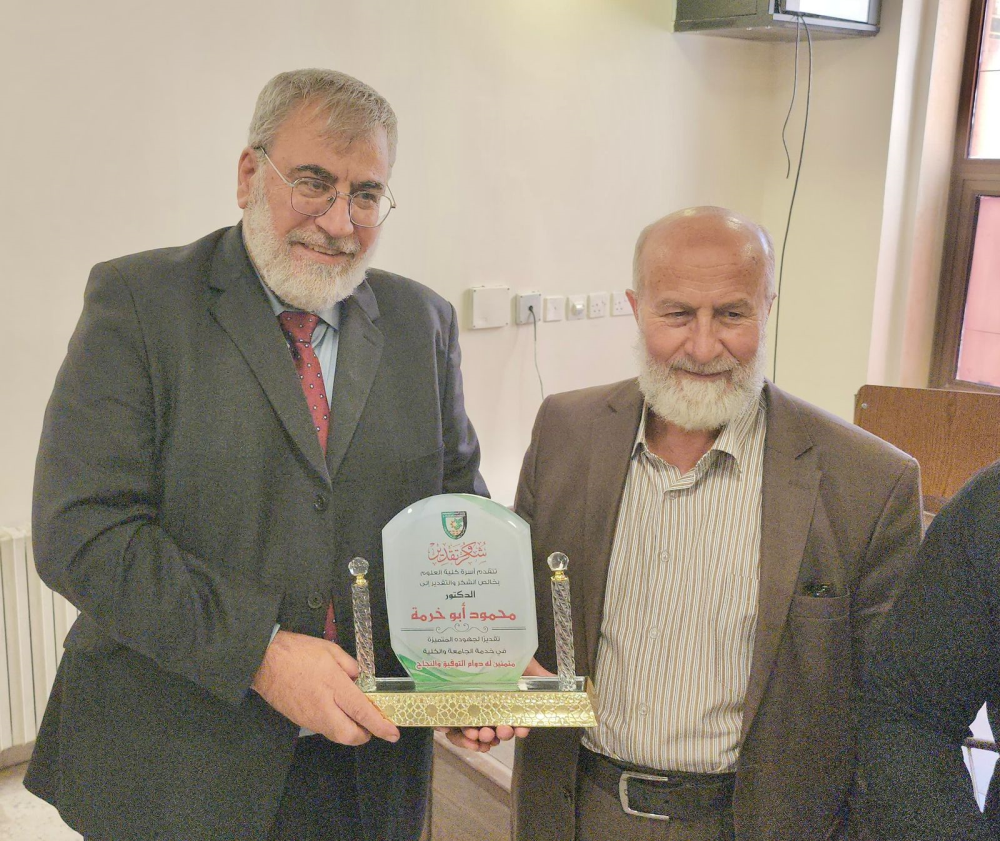 وبالنيابة عن رئيس الجامعة الأستاذ الدكتور أحمد العجلوني، قدّم عميد الكلية درع جامعة البلقاء التطبيقية للدكتور أبو خرمة تقديراً لعطائه وإنجازاته. كما قدّم زملاؤه في كلية العلوم والكلية الطبية المساندة درعاً تذكارياً عربون وفاء وتقدير لمسيرته الطويلة في الجامعة.