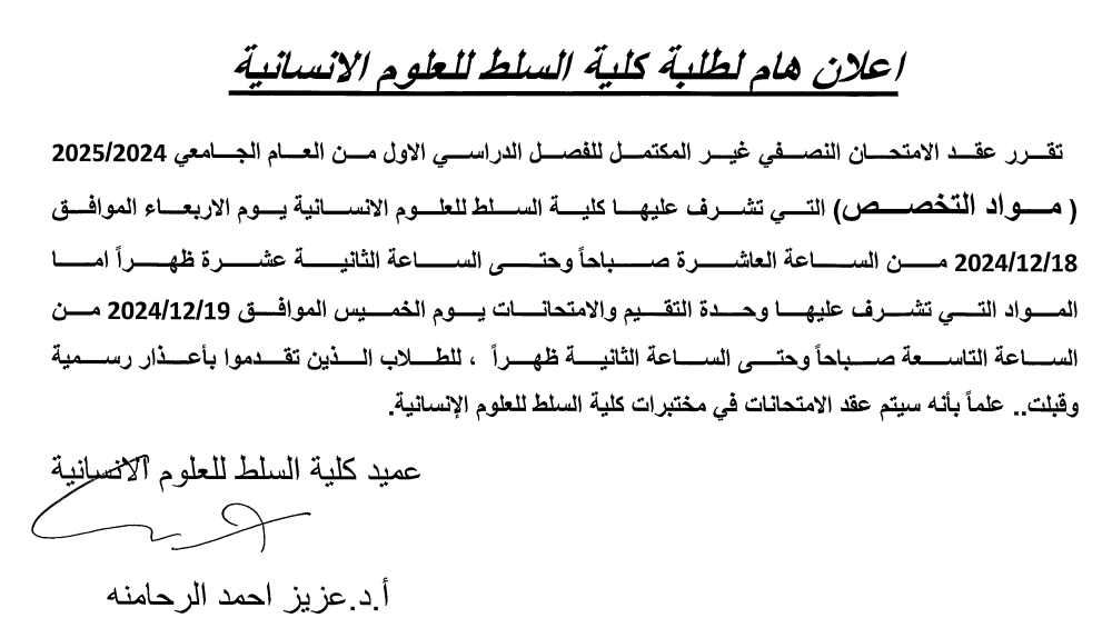 تعلن كلية الحصن الجامعية عن اجراء امتحان الكفاءة الخاص بطلبة البكالوريوس للطلبة المتوقع تخرجهم على الفصل الدراسي الاول للعام الجامعي 2024/2025 ي ...