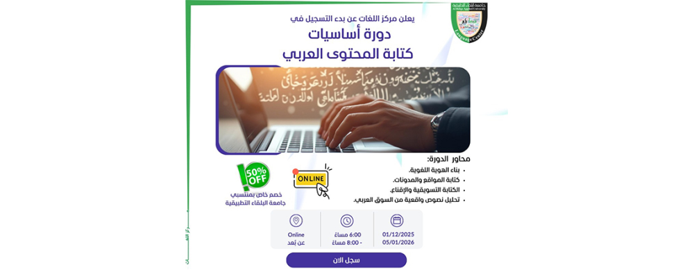 يعلن مركز اللغات – جامعة البلقاء التطبيقية عن فتح باب التسجيل في دورة أساسيات كتابة المحتوى العربي، المصمّمة لتزويدك بمهارات الكتابة الت ...   التفاصيل
