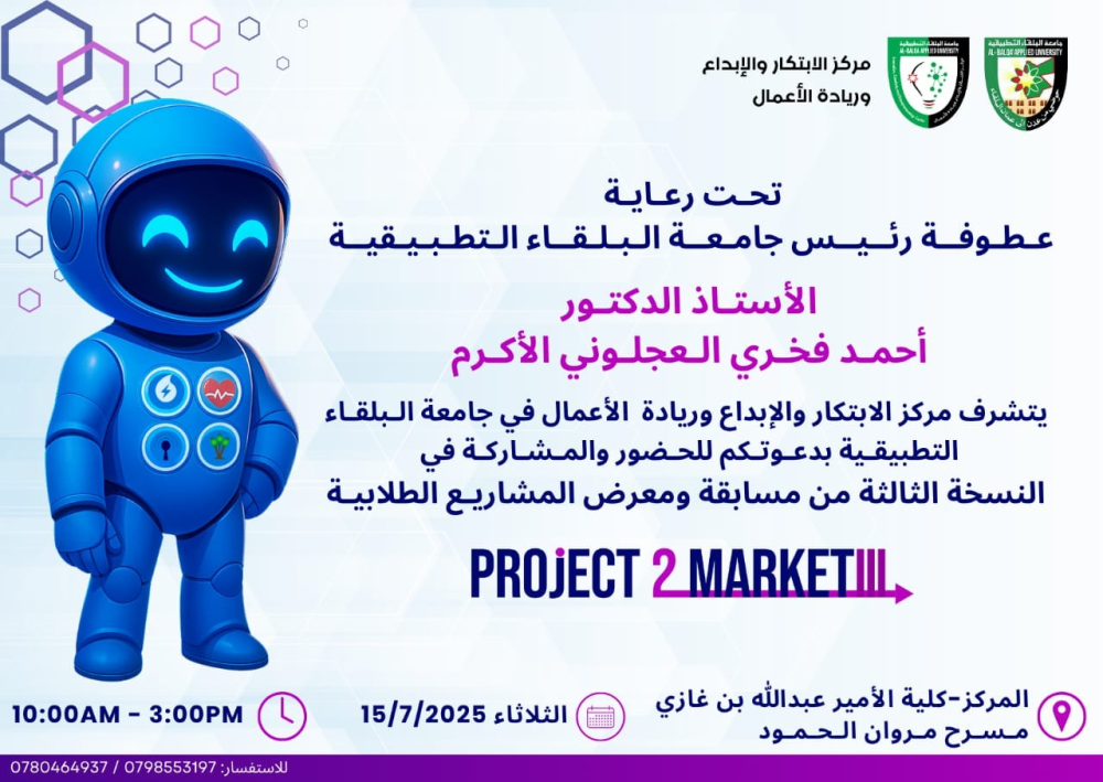 يسر مركز الابتكار والإبداع وريادة الأعمال في جامعة البلقاء التطبيقية، وتحت رعاية عطوفة رئيس الجامعة الأستاذ الدكتور أحمد فخري العجلوني، دعوتكم ا ...