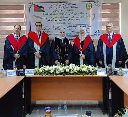 بحضور نخبة من أعضاء الهيئة التدريسية، تمت في كلية الأعمال – جامعة البلقاء التطبيقية مناقشة رسالة ماجستير للطالبة سارة احمد ابراهيم الرشيدا ...