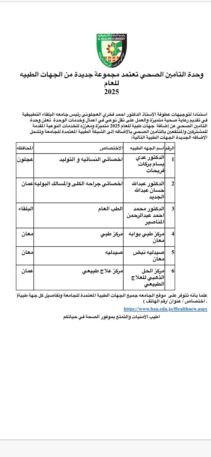 وحدة التأمين الصحي في جامعة البلقاء التطبيقية تعتمد مجموعة جديدة من الجهات الطبية للعام 2025