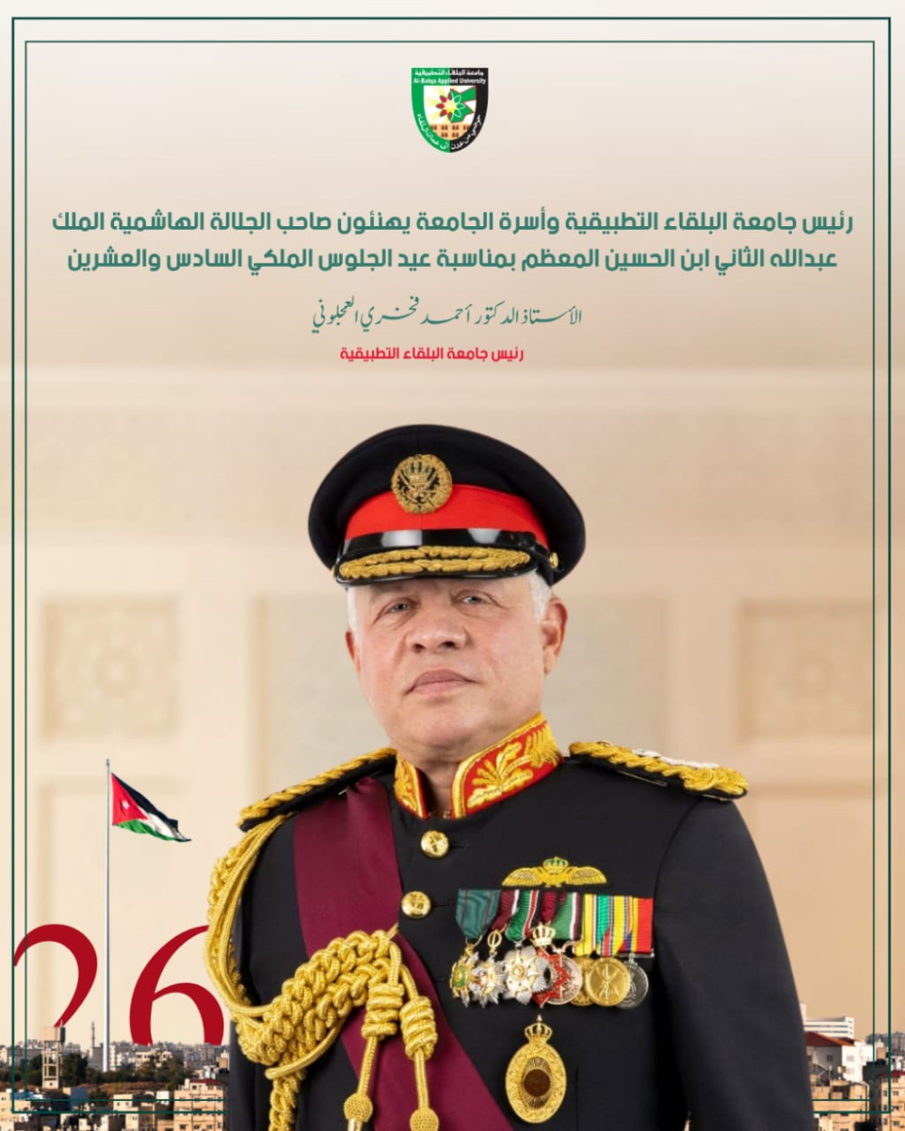 رئيس جامعة البلقاء التطبيقية وأسرة الجامعة يهنئون صاحب الجلالة الهاشمية الملك عبدالله الثاني ابن الحسين المعظم بمناسبة عيد الجلوس الملكي السادس ...