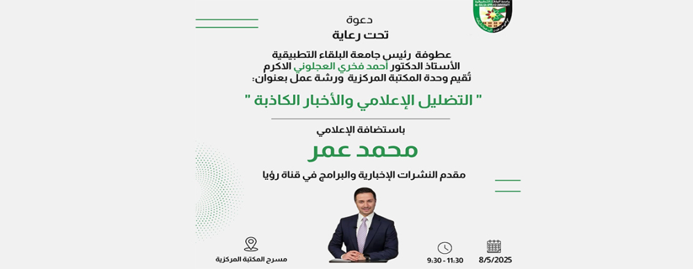 وحدة المكتبة المركزية تدعوكم لحضور ورشة عمل بعنوان (التضليل الإعلامي والأخبار الكاذبة)