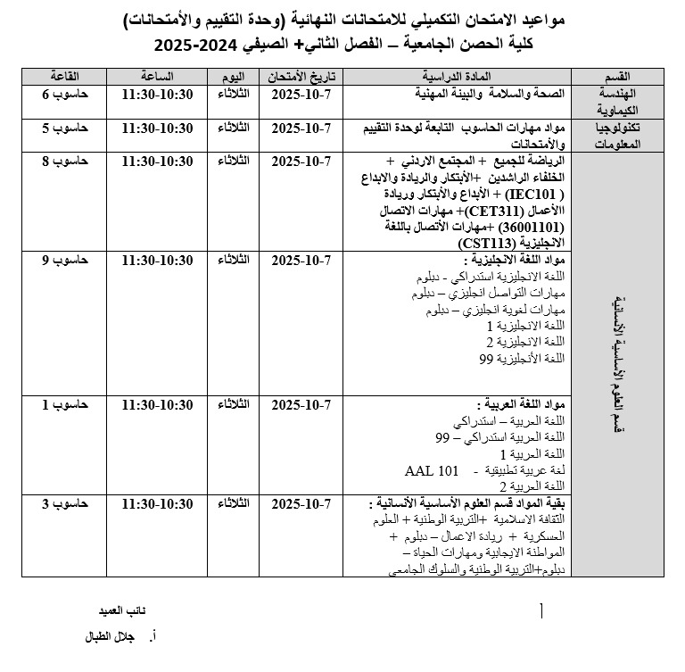 يعلن المسجل العام في جامعة البلقاء التطبيقية عن عقد الامتحان النهائي (غير المكتمل) للفصل الدراسي الثاني والصيفي من العام الجامعي 2024-2025 يوم الثلاثا ...