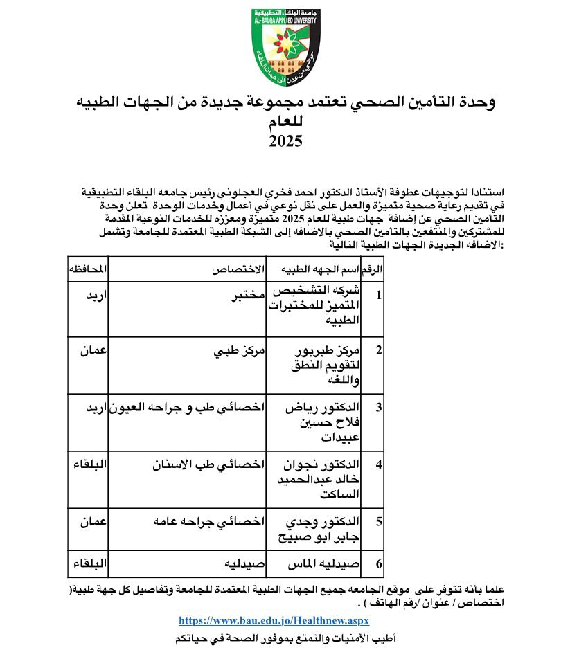 اعلان اسماء المرشحين من أبناء العاملين - جامعة البلقاء التطبيقية - في كلية الطب تخصص الطب للفصل الدراسي الأول 2025-2026 النظامي والموازي
