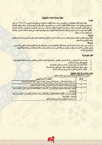 مكتبة جامعية متطورة ،توظف بابداع وابتكار مصادر وتقنيات المعلومات لتوفير بيئة تعليمية غنية ومتنوعة لتصبح مركزاً لجودة التعليم
