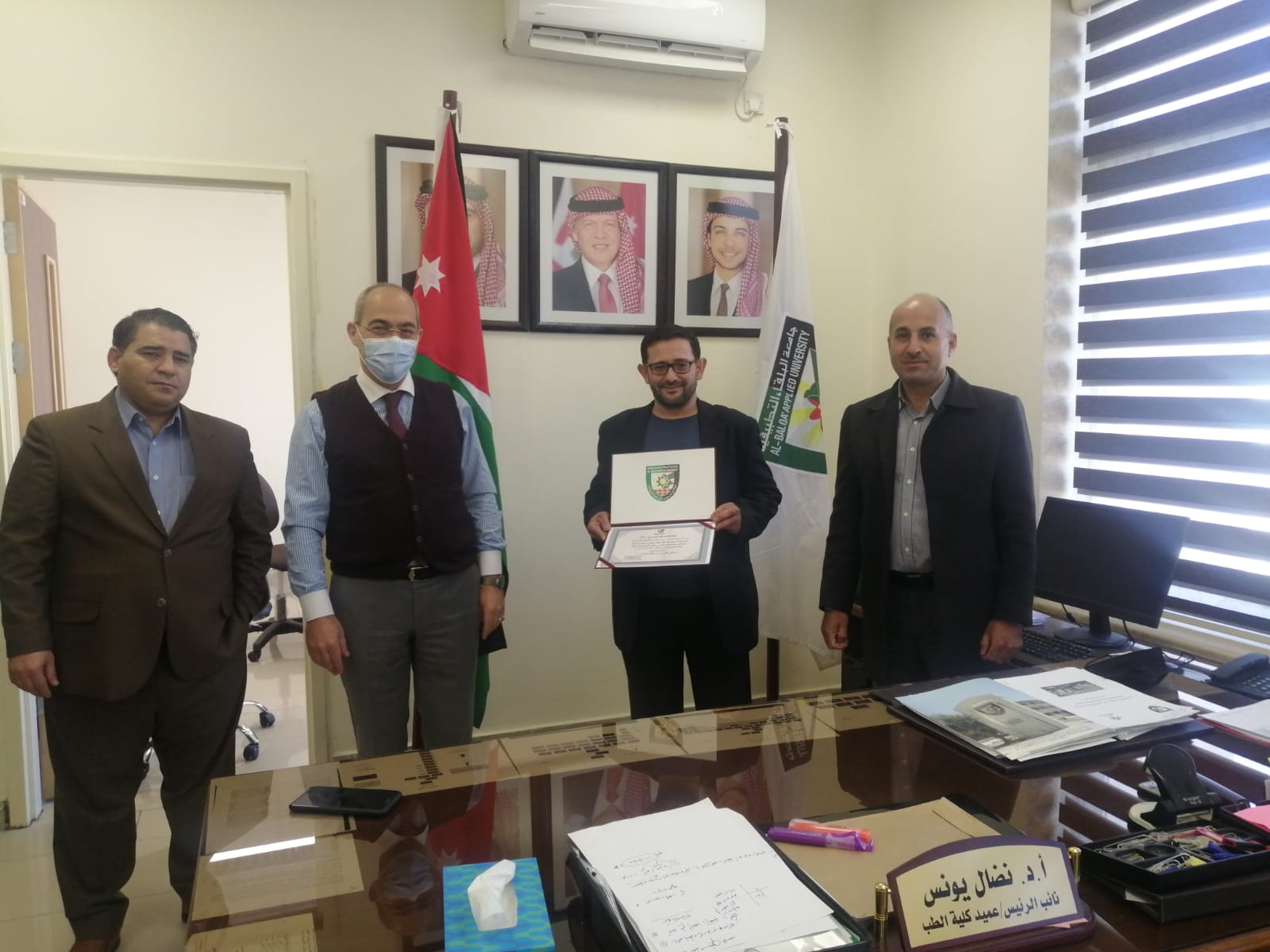 انطلاقا من رؤية جامعة البلقاء التطبيقية في الريادة والابتكار والتميز وتجسيدا لتوجيهات إدارة الجامعة ممثلة برئيسها الأستاذ الدكتور عبدالله سرور الزعبي في تحسين الأداء والتطوير وتحفيز قيم التنافس البناء في العمل لدى الموظفين كرم الاستاذ الدكتور نضال يونس نائب الرئيس لشؤون المراكز رئيس لجنة التأمين الصحي بحضور مدير وحدة التأمين الصحي الدكتور رعد البخيت ومدير دائرة الاشتراكات والعقود الطبية السيد عبدالرحيم عربيات شهادة مندوب التأمين الصحي المثالي لشهر تشرين الأول لعام 2021 للسيد محمد شعبان السعايدة /كلية معان الجامعية وأشار الاستاذ الدكتور نائب الرئيس بأن هذا التكريم هو حافز لمناديب التأمين الصحي في الكليات التابعة للجامعة من اجل التقدم والتطور والمزيد من التميز