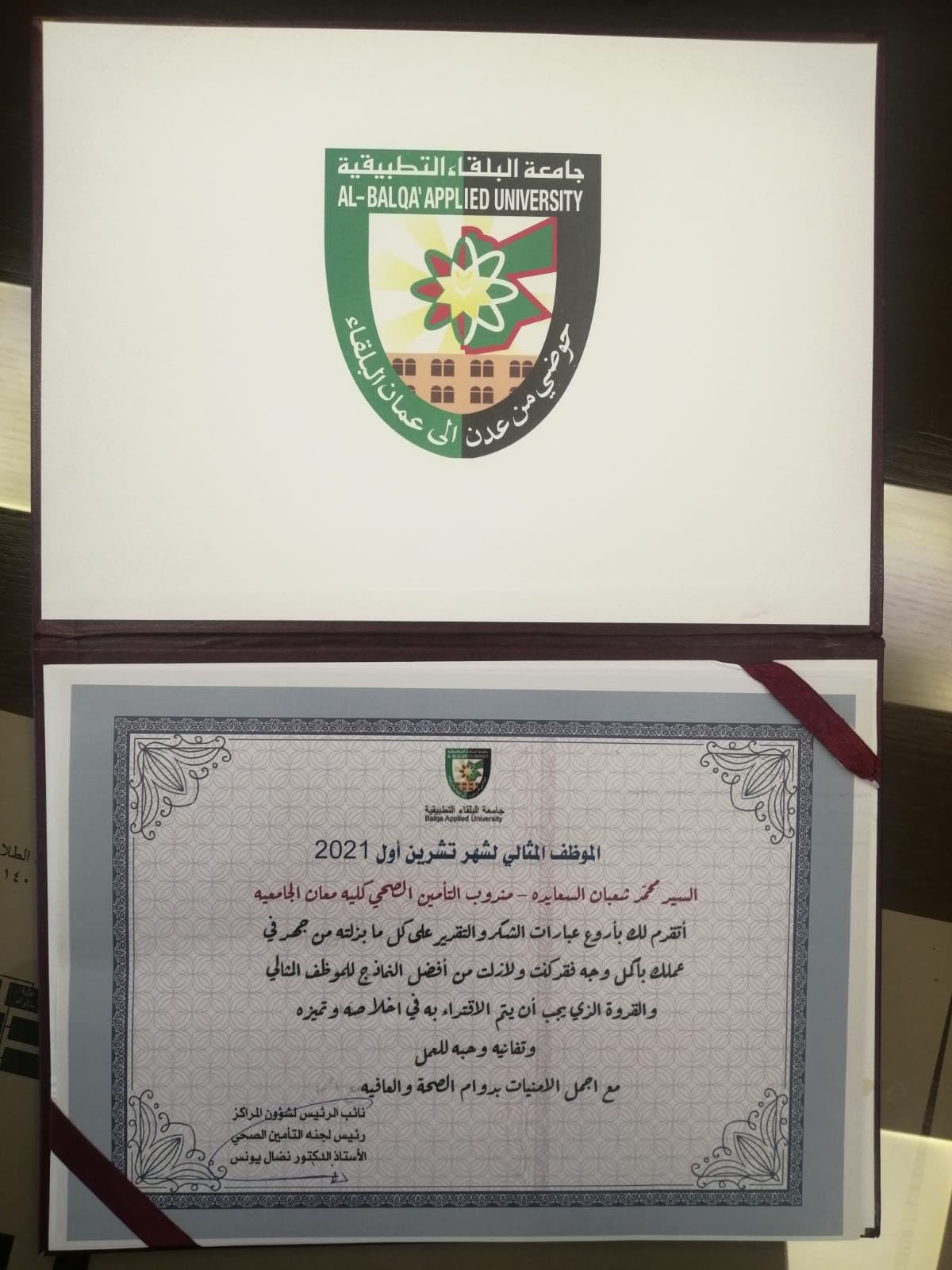شهادة الموظف المثالي لمندوب التأمين الصحي لشهر تشرين الأول لعام 2021 للسيد محمد شعبان السعايدة /كلية معان الجامعية