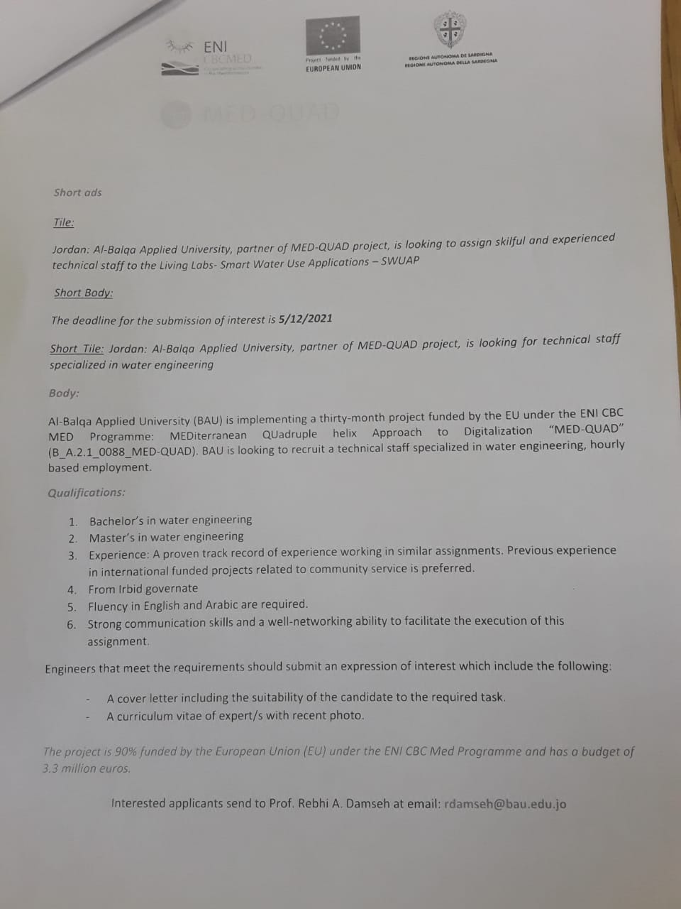 للعمل لصالح مشروع بحث الاستاذ الدكتور ربحي دعامسة منسق المشروع المدعوم من ENI و الموسوم بـ