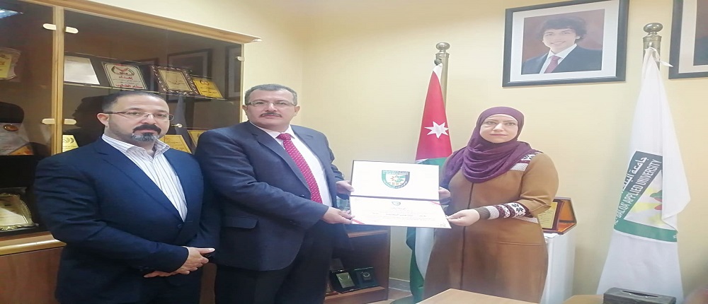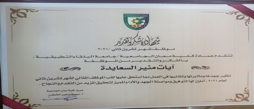انسجاماً مع توجهات إدارة جامعة البلقاء التطبيقية في تحسين الأداء الوظيفي وتطويره، وتحفيز قيم التنافس البنّاء في العمل لدى الموظفين، سلم عميد كلية معان الجامعيّة الأستاذ الدكتور سطام زهير الخطيب شهادة الموظف المثالي (شهادة تقديرية) عن شهر تشرين ثاني2021 للموظفة آيات منير السعايدة من قسم الحاسوب، بحضور نائب العميد ومساعديه ورؤساء الأقسام.