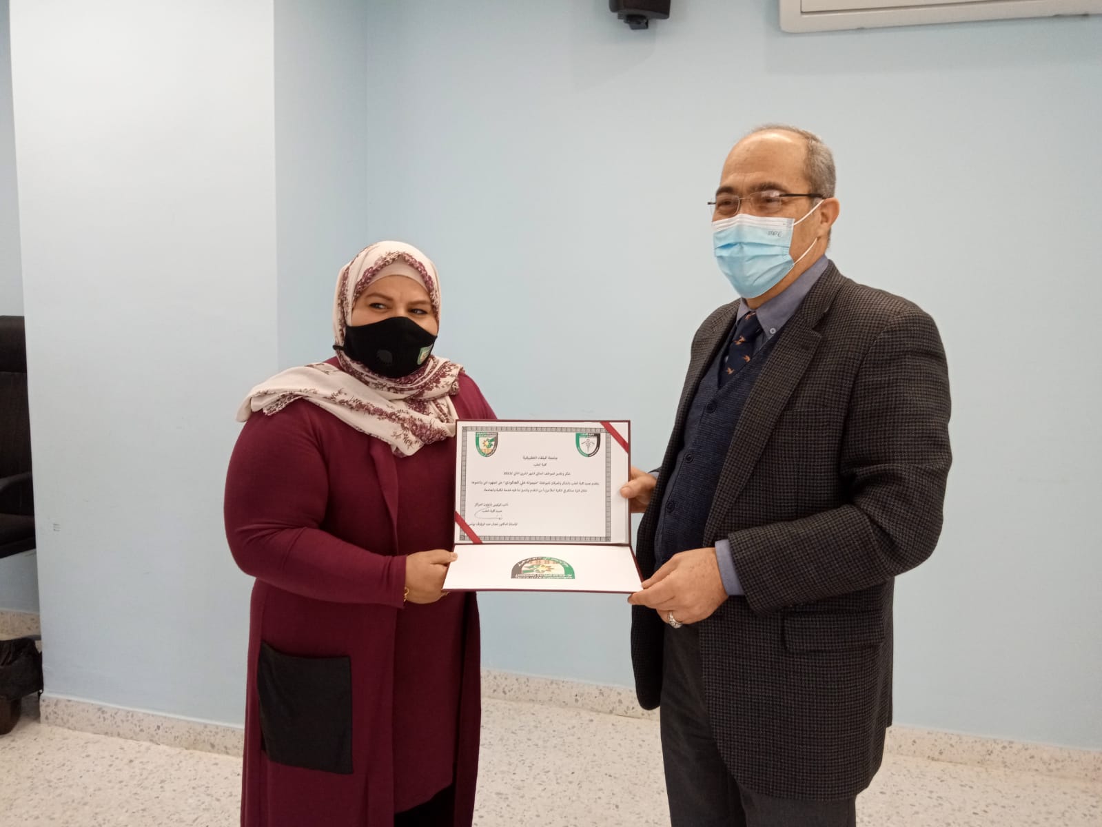 الدكتور عميد الكلية قال : أن تكريم الموظفة الجالودي ياتي نتيجة لجهودها التي بذلتها خلال عملها مشيرا الى ان التكريم هو حافز للعاملين في الكلية من أجل التقدم والتطور والمزيد من التميز.