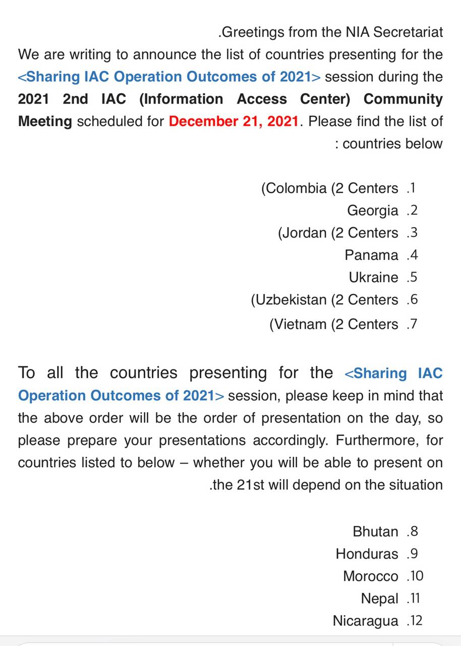 فقد تم اختيار المركز الأردني الكوري للمعلومات وتكنولوجيا الاتصالات، وفقًا لمعايير محددة من قبل الوكالة الوطنية الكورية لمجتمع المعلومات في كوريا، حيث تم توجيه دعوة للمركز في بداية الشهر الحالي لتقديم عرض يعكس تجربته وإنجازاته وخطته المستقبلية في مجال الوصول للمعلومات ‏ في ظل جائحة كورونا. وعليه، فقد اجتاز المركز هذه المرحلة وتم اختياره للتحدث في الاجتماع وتقديم العرض.