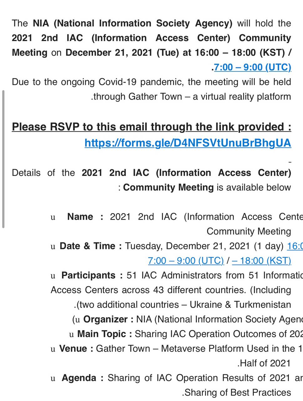 عقدت الوكالة الوطنية الكورية لمجتمع المعلومات (NIA) في كوريا اليوم الثلاثاء الموافق 21 كانون الأول 2021 الاجتماع الثاني لمجتمع مركز الوصول إلى المعلومات (ًIAC) لعام 2021 عبر منصة الواقع الافتراضي Gather Town نتيجة لجائحة كورونا، وفي هذا الاجتماع تم مشاركة نتائج عمل مراكز الوصول إلى المعلومات خلال عام 2021 وتبادل أفضل الممارسات من قبل المسؤولين الذين تم اختيارهم من بين 51 مسؤول مركز في 43 دولة من بينها الأردن. حيث تم اختيار المركز الأردني الكوري للمعلومات وتكنولوجيا الاتصالات (jkc) في جامعة البلقاء التطبيقية لتقديم عرض حول تجربته وما تم إنجازه خلال هذا العام في ظل جائحة كورونا اضافة الى الخطة والاهداف المستقبلية للمركز وكان العرض الثالث في الاجتماع بعد عرض كل من المراكز في كولومبيا وجورجيا، وأيضا شاركت المراكز من اوكرانيا واوزبكستان وفيتنام في تقديم العروض الخاصة بها.