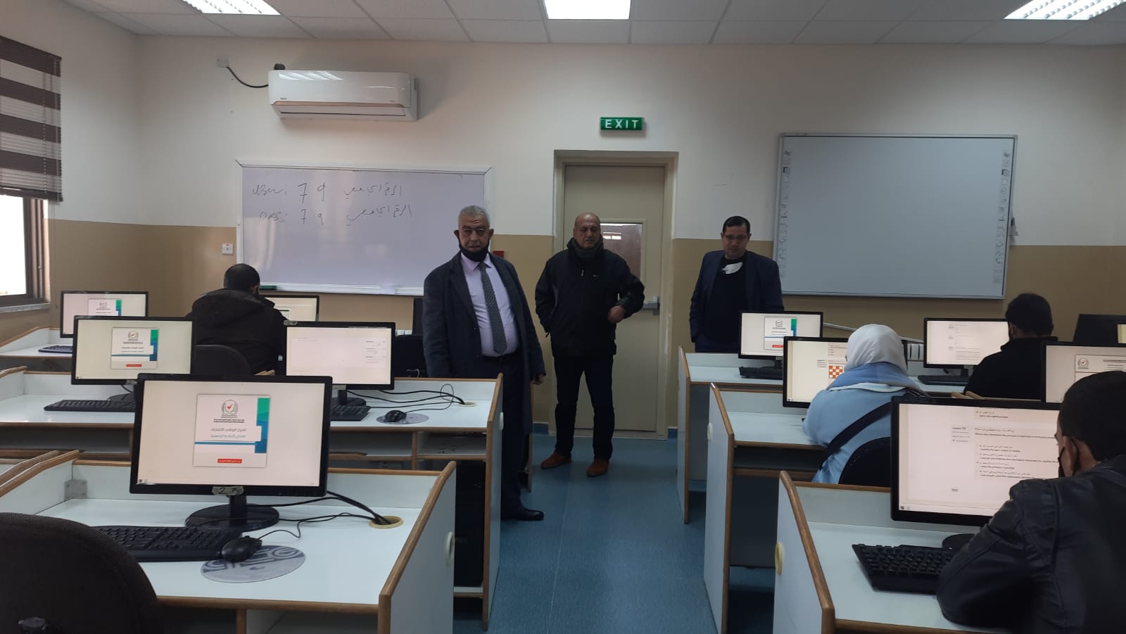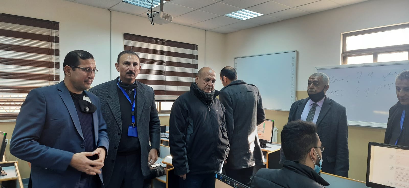 ورافق عميد الكلية الاستاذ الدكتور جاسر عنانزه نائب العميد والدكتور ايمن فريحات مساعد العميد لشؤون التخطيط والتطوير والجودة والمهندس محمد انجادات رئيس قسم الحاسوب منسق التعليم الالكتروني والامتحانات المحوسبه والدكتور خالد الربابعه رئيس قسم التخطيط والتطوير والجودة.