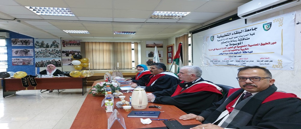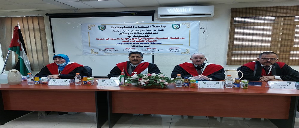تم في مساء يوم الأحد الموافق 2/1/2022، مناقشة رسالة ماجستير للطالبة تسنيم عناد عودة البكار تخصص الإدارة التربوية ،  قسم العلوم التربوية بعنوان (دور تطبيق المحاسبية التعليمية في تطوير الإدارة المدرسية في مديرية التربية والتعليم للواء ناعور )