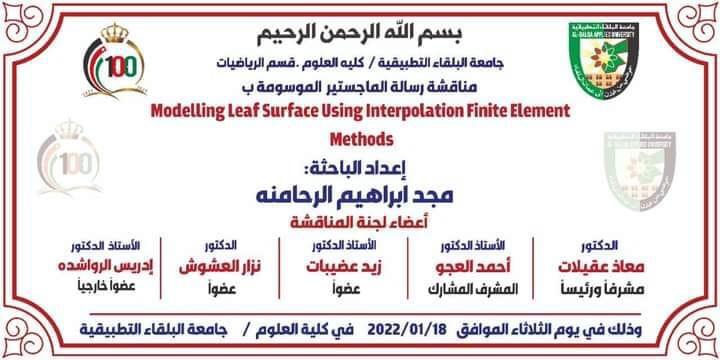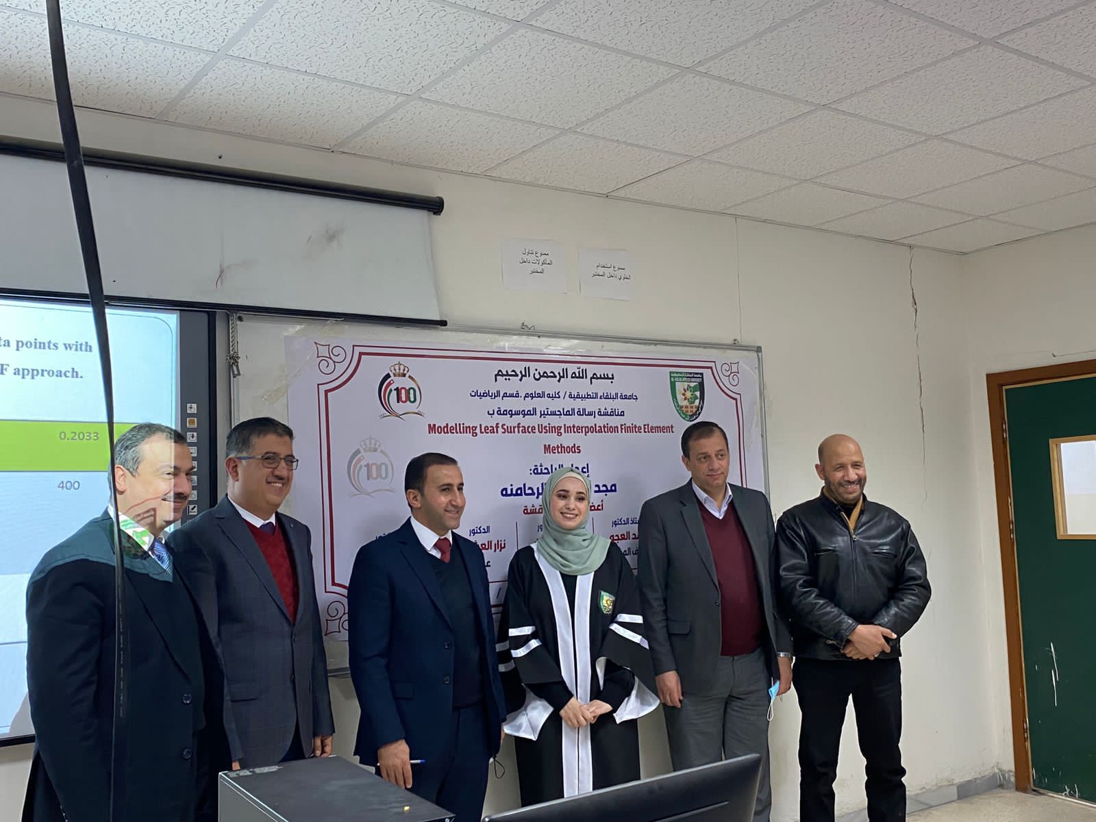 وبإشراف الدكتور معاذ العقيلي (المشرف الرئيسي) والأستاذ الدكتور أحمد العجو (المشرف المشارك)، وبحضور لجنة المناقشة ممثلة بالأستاذ الدكتور زيد عضيبات، الدكتور نزار العشوش، والممتحن الخارجي من جامعة اليرموك الأستاذ الدكتور إدريس الرواشدة.