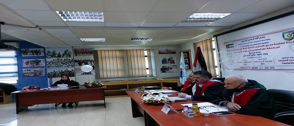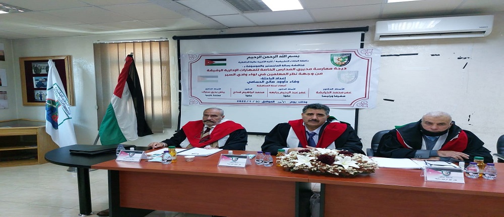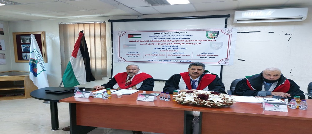 تم في صباح يوم الأحد  الموافق 30/1/2022 ، مناقشة رسالة ماجستير للطالبة وفاء داوود صالح الحسامي تخصص الادارة التربوية ،  قسم العلوم التربوية   بعنوان (درجة ممارسة مديري المدارس الخاصة للمهارات الإدارية الرشيقة من وجهة نظر المعلمين في لواء وادي السير)
