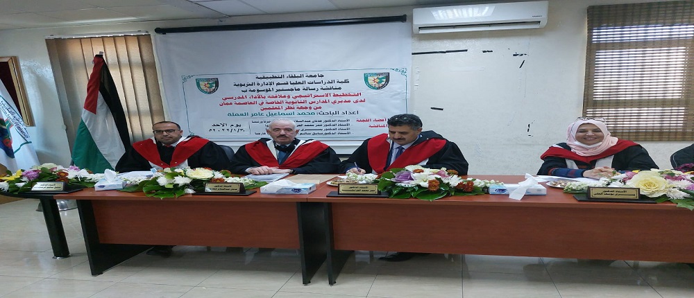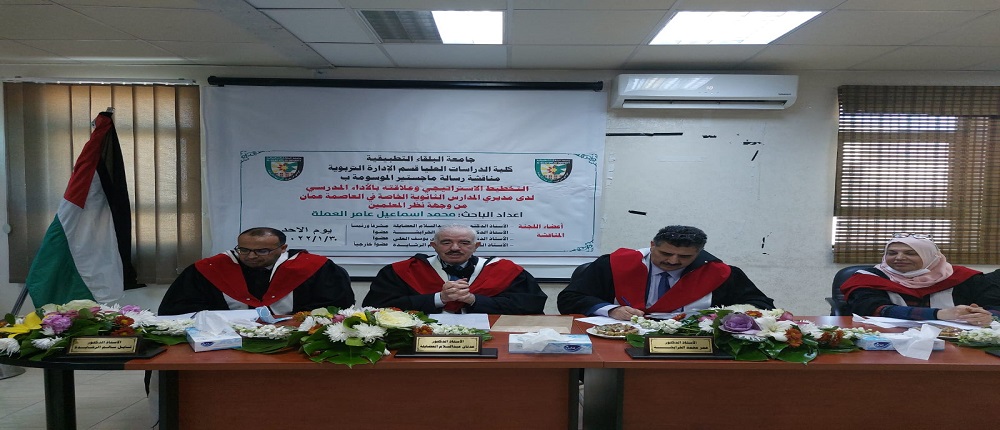 تم في مساء يوم الأحد الموافق 30/1/2022 ، مناقشة رسالة ماجستير للطالب محمد اسماعيل عامر العملة تخصص الادارة التربوية ، قسم العلوم التربوية بعنوان (التخطيط الاستراتيجي وعلاقته بالأداء المدرسي لدى مديري المدارس الثانوية الخاصة في العاصمة عمان من وجهة نظر المعلمين)