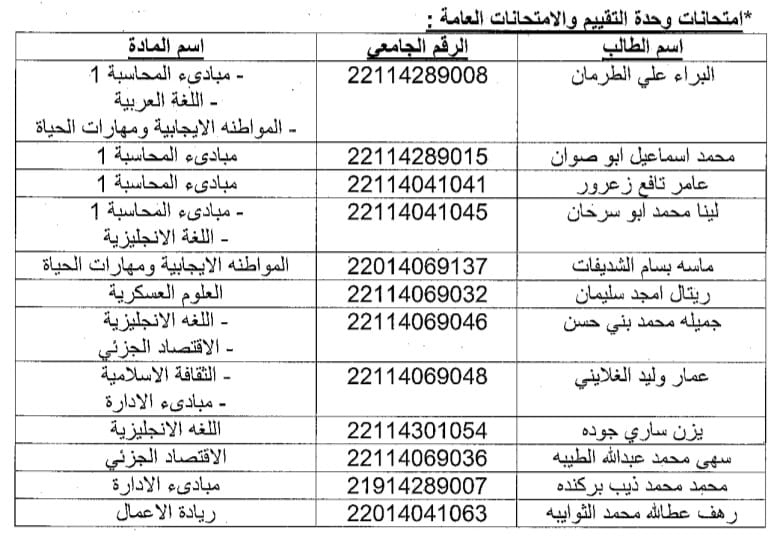 سيتم عقد الامتحان لطلاب غيرالمكتمل للمواد التي تشرف عليها وحدة التقييم و الامتحانات العامة للطلبة الذين تقدموا باعذار مقبولة للفصل الدراسي الأول للعام2021-2022والمذكورة اسماءهم بالجداول ادناه يوم الخميس الموافق 3-3-2022الساعة الحادي عشر صباحاً و لغاية الساعةالثانية عشر في حرم الكلية (مختبرات الحاسوب )فقط و كل من يتغيب عن الامتحان ترصد له صفر الجامعة.