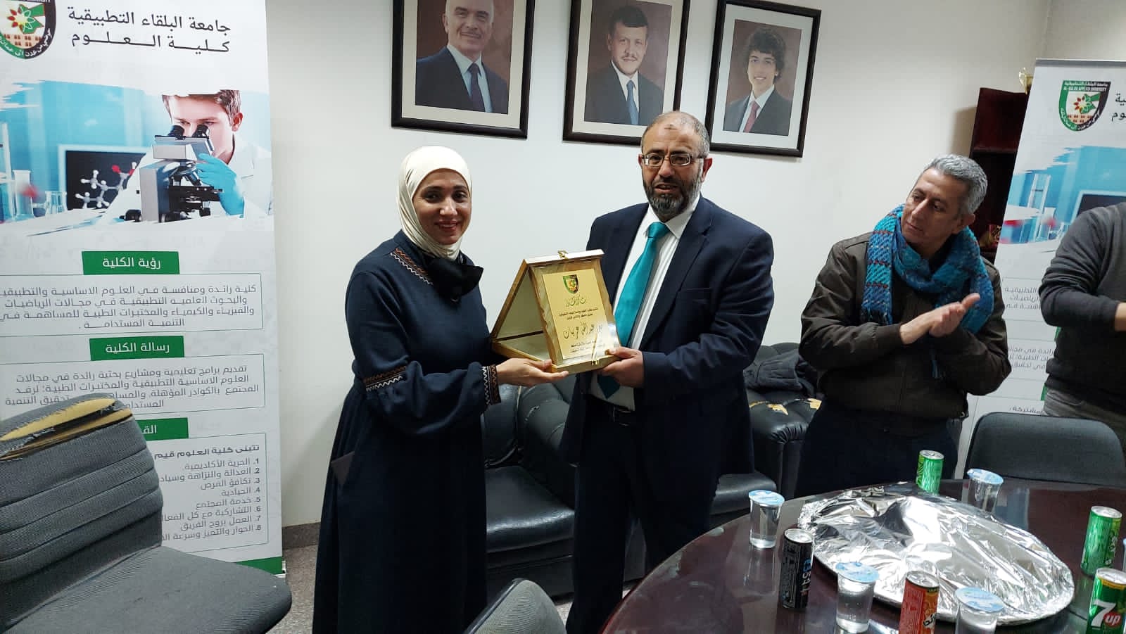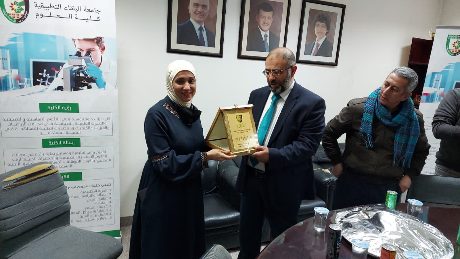 تحت رعاية عميدة كلية العلوم الاستاذ الدكتورة هاله اهلال الجبر وبحضور الزملاء من اعضاء الهيئة التدريسية والادارية تكريم الزميل معن عربيات / رئيس قسم اللوازم في كلية العلوم بعد قبول استقالته من الجامعة .