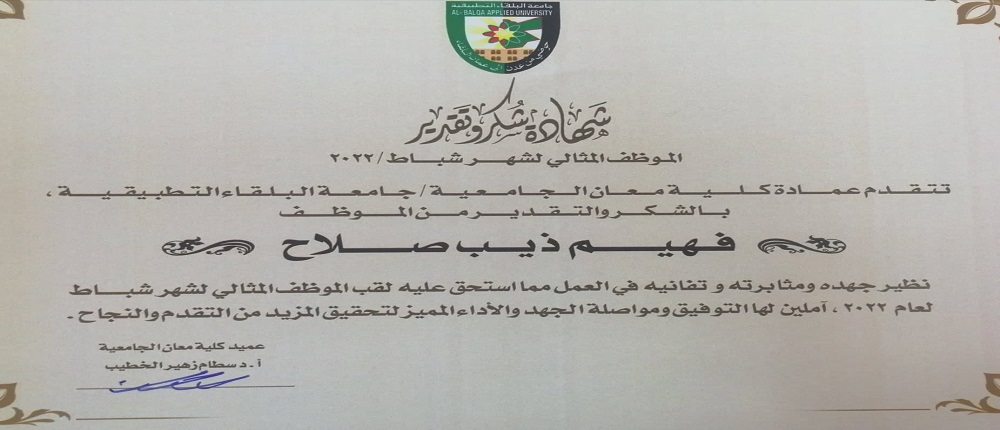 انسجاماً مع توجهات رئاسة جامعة البلقاء التطبيقية في تحسين الأداء الوظيفي وتطويره، وتحفيز قيم التنافس البنّاء في العمل لدى الموظفين، سلم عميد كلية معان الجامعيّة الأستاذ الدكتور سطام زهير الخطيب شهادة الموظف المثالي (شهادة تقديرية) عن شهر شباط 2022 للموظف فهيم ذيب صلاح رئيس قسم اللوازم، بحضور نائب العميد ومساعديه ورؤساء الأقسام.