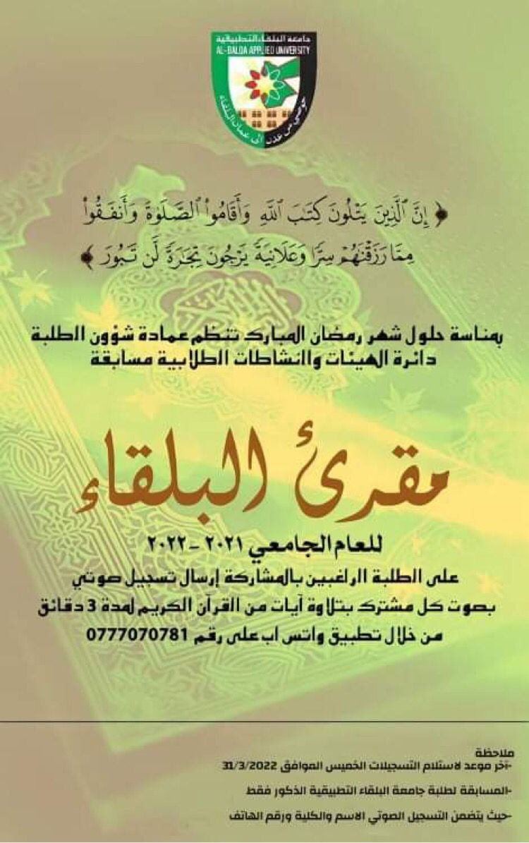 بمناسبة حلول شهر رمضان المبارك تنظم عمادة شؤون الطلبة دائرة الهيئات والنشاطات الطلابيه مسابقة مقرئ البلقاء للعام الجامعي 2022/2021