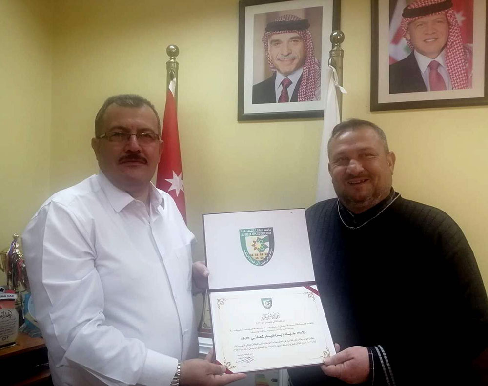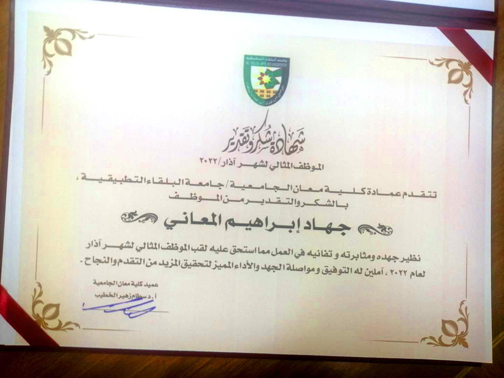 انسجاماً مع توجهات رئاسة جامعة البلقاء التطبيقيّة في تحسين الأداء الوظيفي وتطويره، وتحفيز قيم التنافس البنّاء في العمل لدى الموظفين، سلم عميد كلية معان الجامعيّة الأستاذ الدكتور سطّام زهير الخطيب شهادة الموظف المثالي (شهادة تقديرية) عن شهر آذار 2022م للموظف جهاد إبراهيم المعاني / قسم الحركة، بحضور نائب العميد ومساعديه ورؤساء الأقسام.