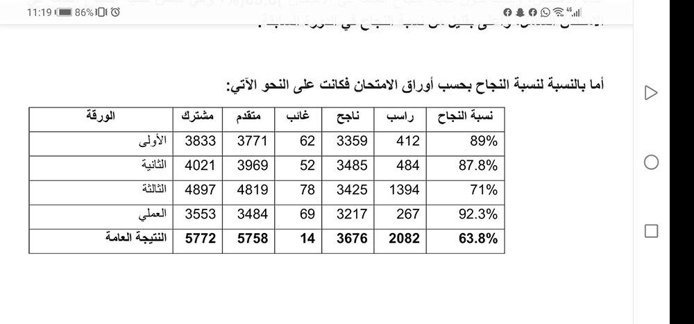 أما بالنسبة لنسبة النجاح بحسب أوراق الامتحان فكانت على النحو الآتي: