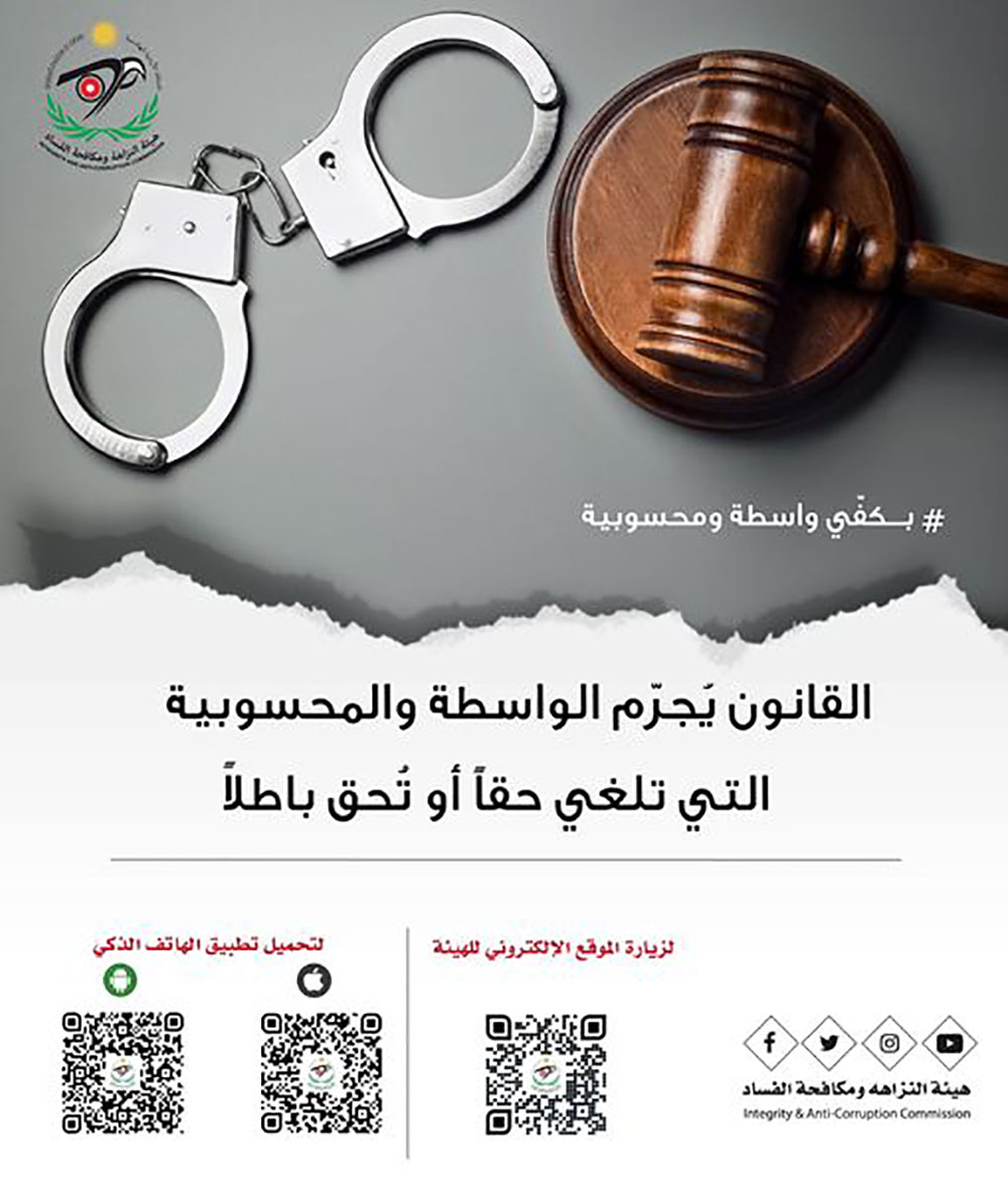 مجلس الهيئة يرى في هذه الحملة التي وسمت بشعار " بكفي واسطة ومحسوبية " وتستمر ثلاثة أشهر أنها إعمالُ لمساعيها المستمرة في محاربة جميع أشكال الفساد . ونشر قيم النزاهة مستذكرًا نص المادة 16 من قانون النزاهة ومكافحة الفساد رقم 13 لسنة 2016 وتعديلاته التي تجرم الواسطة والمحسوبية التي تلغي حقًا وتُحق باطلًا .