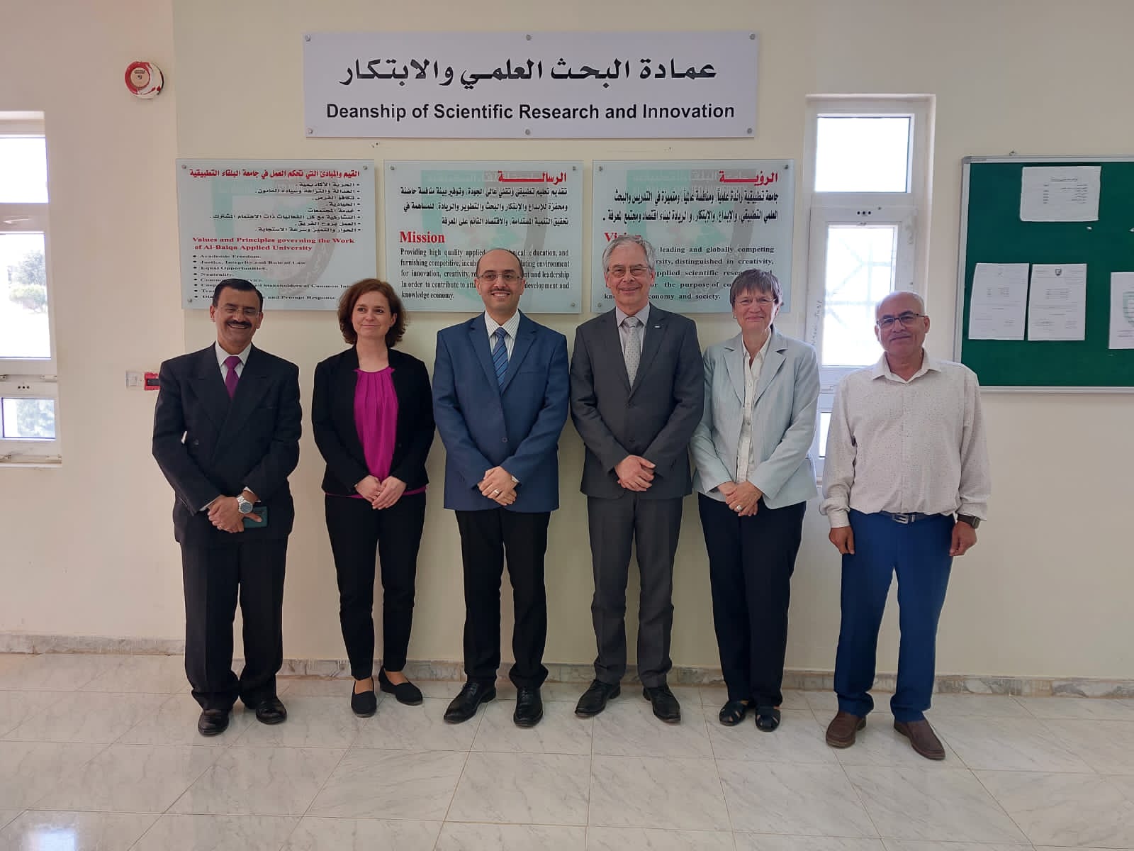 استضافت جامعة البلقاء التطبيقية وفدًا من مؤسسة البحوث الألمانية Deutsche Forschungsgemeinschaft (DFG) وهي مؤسسة لدعم وتمويل البحوث في عدد من الحقول العلمية والإنسانية، المكون من د. يورج شنايدر مدير العلاقات الدولية ود. جينيفر غرناو. والتقى الوفد الزائر مع الأستاذ الدكتور سعيد أبو رمان عميد البحث العلمي والابتكار/مساعد الرئيس لشؤون التعاون الدولي، والاستاذ الدكتور عمر العايد نائب عميد البحث العلمي والابتكار والأستاذ الدكتور محمد أبو دية رئيس هيئة تحرير المجلة الاردنية للهندسة والصناعات الكيميائية والسيدة غديرالدبعي من وحدة التعاون والعلاقات الدولية.