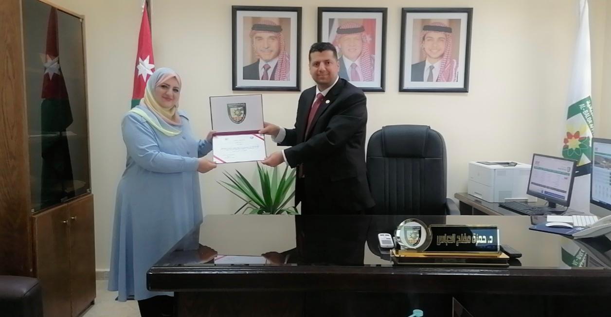 انطلاقاً من توجيهات إدارة الجامعة في تحسين الأداء والتطوير وتحفيز قيم التنافس البناء في العمل لدى الموظفين كرم الدكتور حمزة الدباس عميد كلية الذكاء الاصطناعي الموظفة (روان خليفات) بشهادة الموظف المثالي لشهر نيسان / 2022 تقديراً لجهودها في العمل والتزامها بمعايير الموظف المثالي المعتمدة في الكلية،