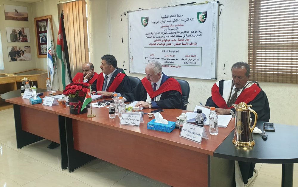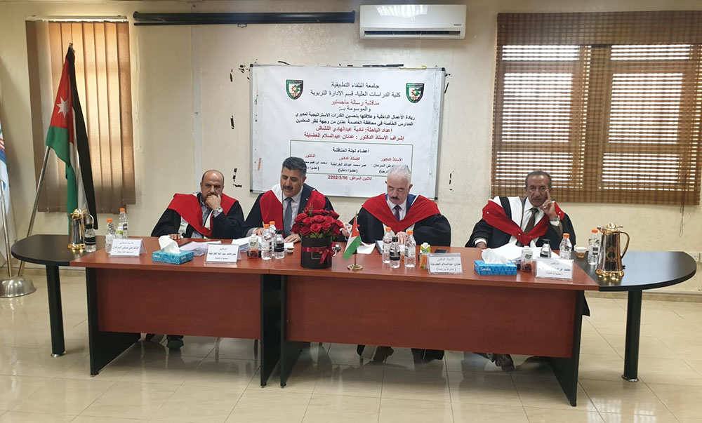 تم في مساء يوم الأثنين الموافق 16/5/2022  ، مناقشة رسالة ماجستير للطالبة نادية عبدالهادي النشاش تخصص الادارة التربوية ،  قسم العلوم التربوية بعنوان (ريادة الأعمال الداخلية وعلاقتها بتحسين القدرات الاستراتيجة لمديري المدارس الخاصة في محافظة العاصمة عمان من وجهة نظر المعلمين )