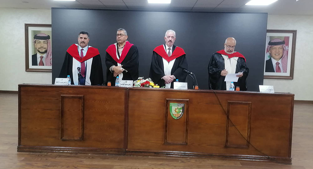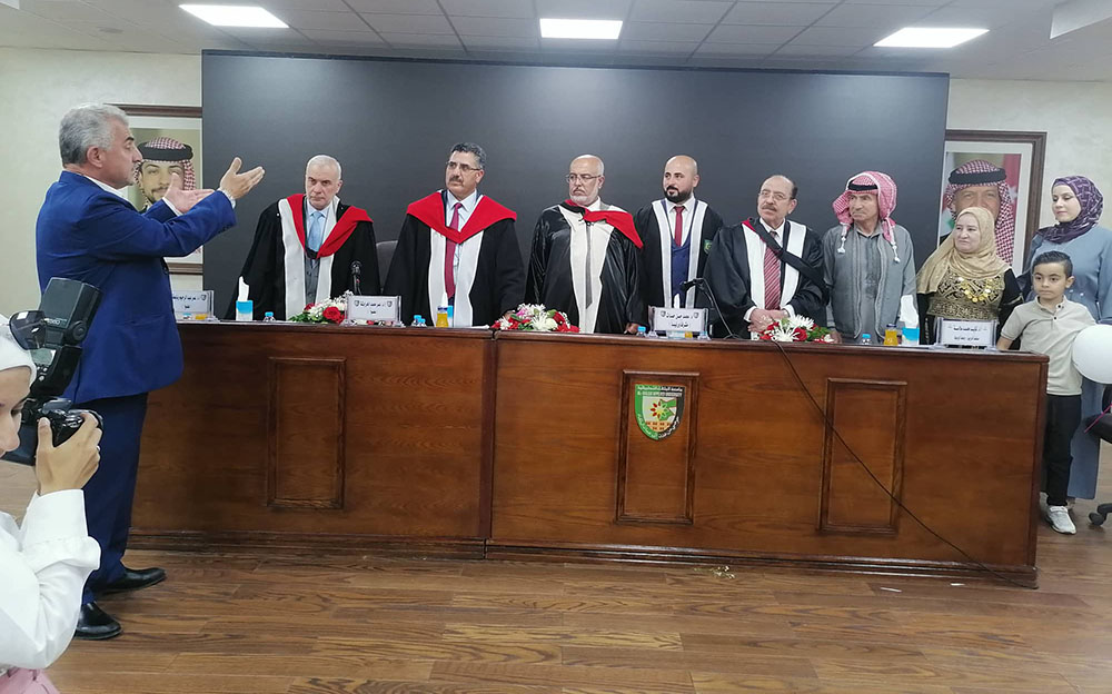 و تشكلت لجنة المناقشة برئاسة وأشراف الاستاذ الدكتور محمد حمادات من كليةعجلون الجامعية والاستاذ الدكتور عمر عبد الرحيم ربابعه مناقشاً داخلياً / كلية عجلون الجامعية والاستاذ الدكتورعمر خرابشه مناقشاً داخلياً / كلية الاميرة عالية الجامعية والاستاذ الدكتوركايد محمد سلامة مناقشاً خارجياً / جامعة اليرموك