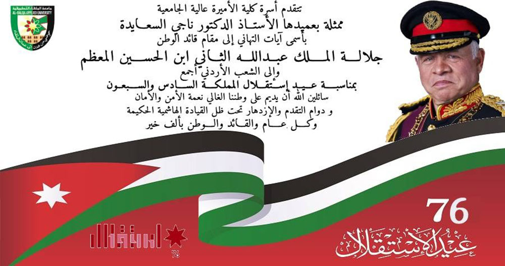 تهنئة من كلية الاميرة عاليه الجامعيه الى جلالة الملك عبدالله الثاني ابن الحسين المعظم والى الشعب الاردني بمناسبة عيد الاستقلال
