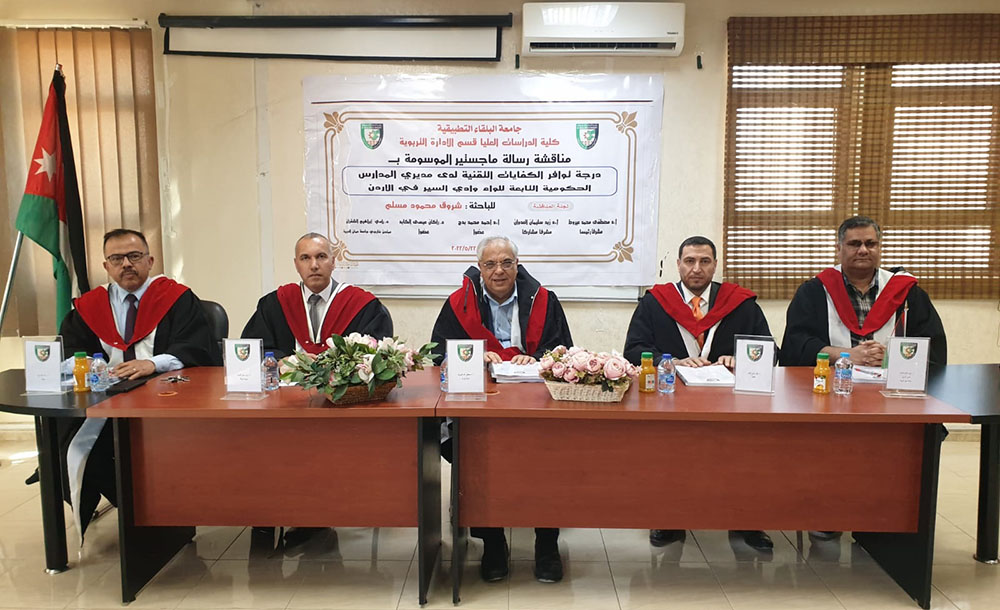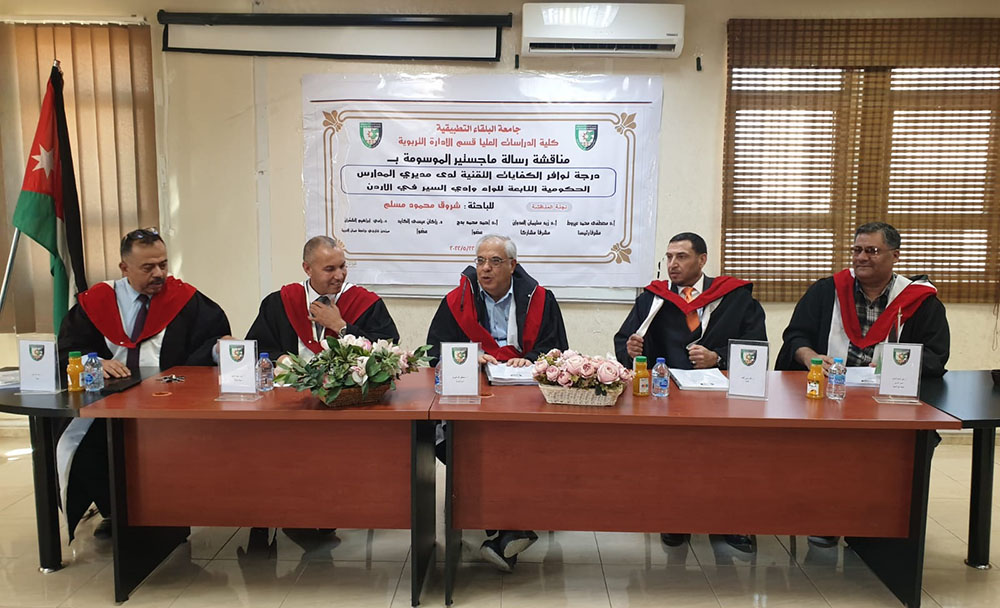 تم في صباح يوم الأحد الموافق 22/5/2022  ، مناقشة رسالة ماجستير للطالبة شروق محمود مسلم  تخصص الإدارة التربوية ،  قسم العلوم التربوية  بعنوان ( درجة توافر الكفايات التقنية لدى مديري المدارس الحكومية التابعة للواء وادي السير في الأردن)