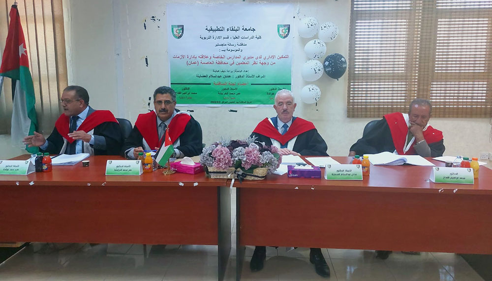 تم مساء يوم الخميس الموافق 2/6/2022 ،مناقشة رسالة ماجستير للطالبة براءة نايف موسى عبابنة  برنامج ماجستير الإدارة التربوية قسم العلوم التربوية بعنوان :