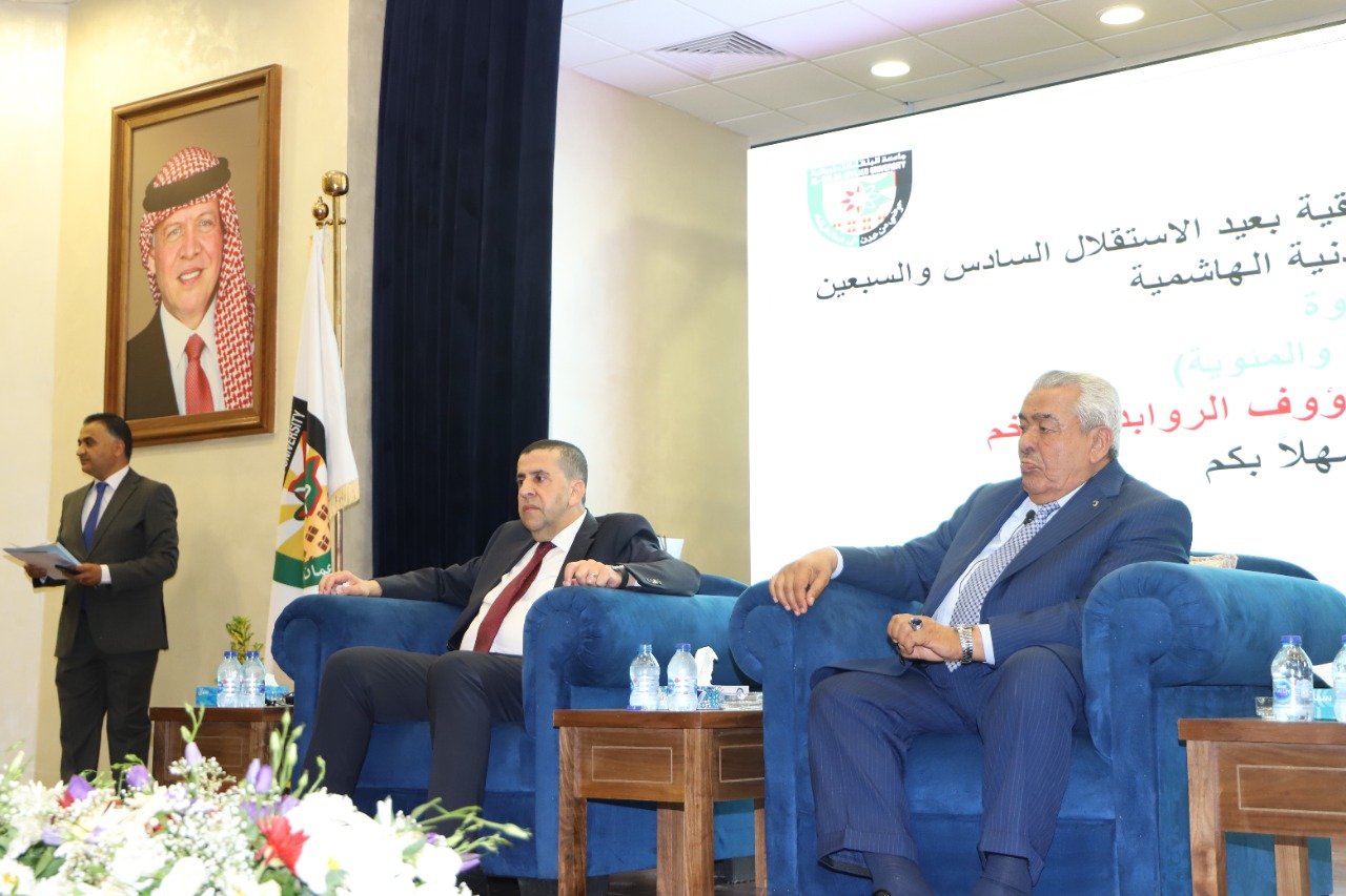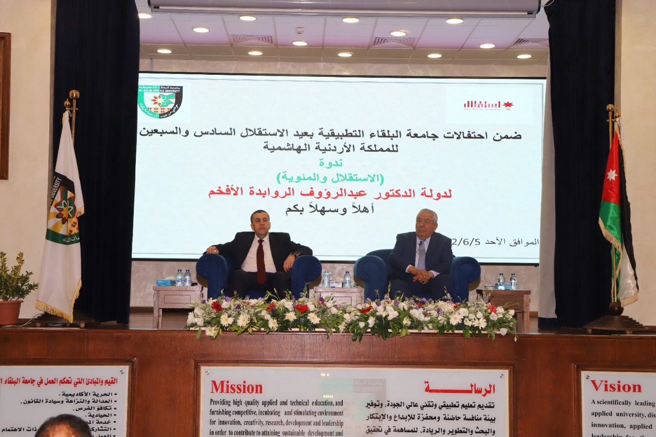 وأضاف دولة عبد الرؤوف الروابدة في الندوة التي حضرها نواب محافظة البلقاء وعدد من ممثلي عن المؤسسات الرسمية والأهلية ووجهاء المحافظة والأساتذة نواب رئيس الجامعة وعمداء الكليات وطلبة الجامعة ، اننا بنينا الاردن بجهد اليمين وعرق الجبين كان بناؤه قصة دور وقصة امل اردناه بقيادة الصيد من بنى هاشم قاعدة عروبية منذورا لدور عروبي في التحرير والحياة الافضل ، فاء اليه كل احرار الامة واحتمى كل من هجرتهم اوطانهم ينشدون الحرية ويطلبون الرزق ووجدوا الحضن الدافئ والصدر الرؤوم .