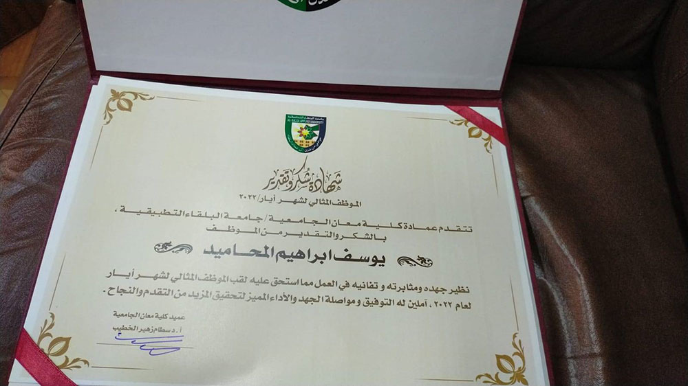 انسجاماً مع توجهات رئاسة جامعة البلقاء التطبيقية في تحسين الأداء الوظيفي وتطويره، وتحفيز قيم التنافس البنّاء في العمل لدى الموظفين، سلم عميد كلية معان الجامعيّة الأستاذ الدكتور سطام زهير الخطيب شهادة الموظف المثالي (شهادة تقديرية) عن شهر أيار 2022 للموظف يوسف إبراهيم المحاميد / قسم المحاسبة، بحضور نائب العميد ومساعديه ورؤساء الأقسام. وأكد الخطيب بأن هذا التكريم جاء حافزاً لجميع العاملين في الكلية من أجل بذل المزيد من العطاء المميز وخلق روح المنافسة بين الموظفين، وتقديراً لجهود الموظف المبذولة في تنفيذ الأعمال والواجبات بالسرعة والدقة المطلوبة، الأمر الذي ينعكس إيجاباً على الكلية.