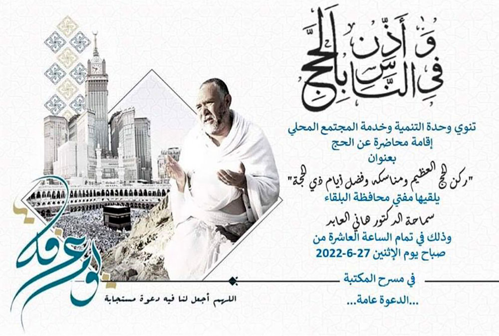 تدعوكم وحدة التنمية وخدمة المجتمع المحلي لحضور محاضرة لمفتي محافظة البلقاء سماحة الدكتور هاني العابد حول ركن الحج العظيم ومناسكه وفضل ايام ذي الحجة وذلك في تمام الساعة العاشرة من صباح يوم غد الاثنين الموافق 2022/6/26.