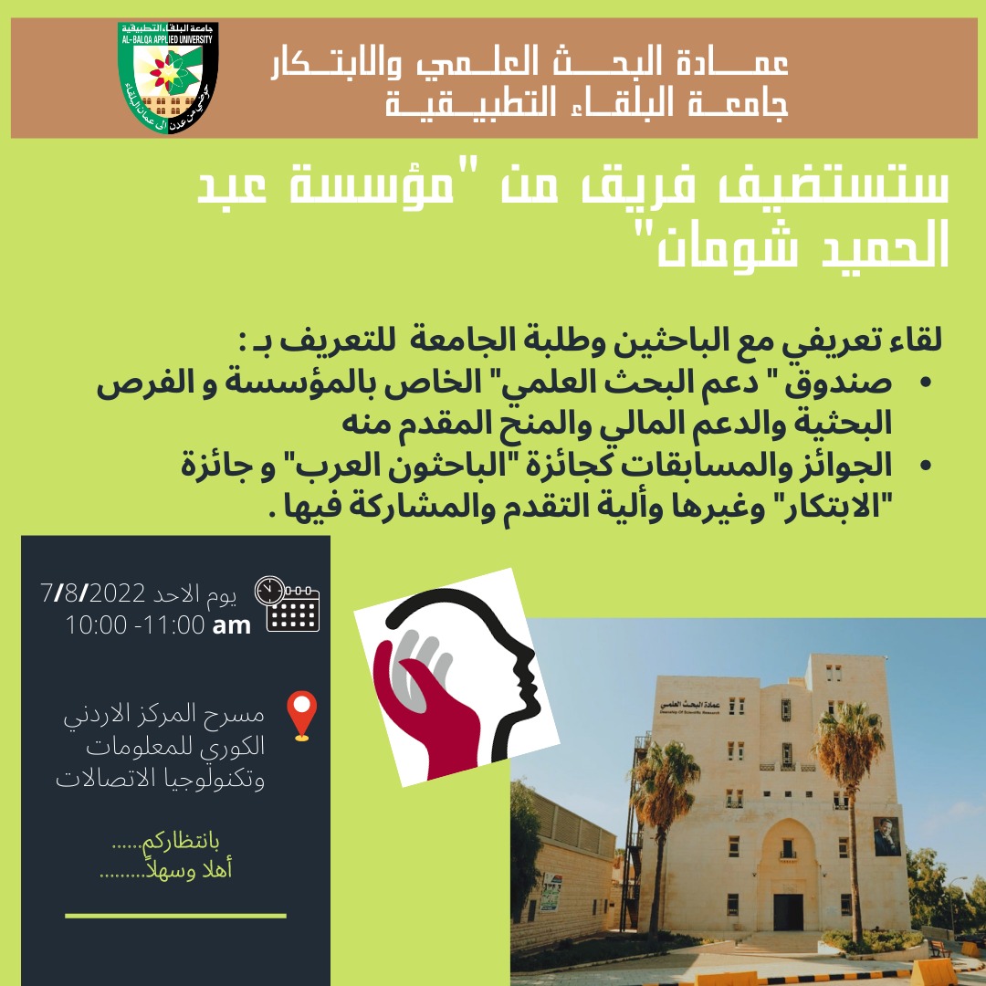 عمادة البحث العلمي والابتكار ستستضيف فريق من مؤسسة عبدالحميد شومان